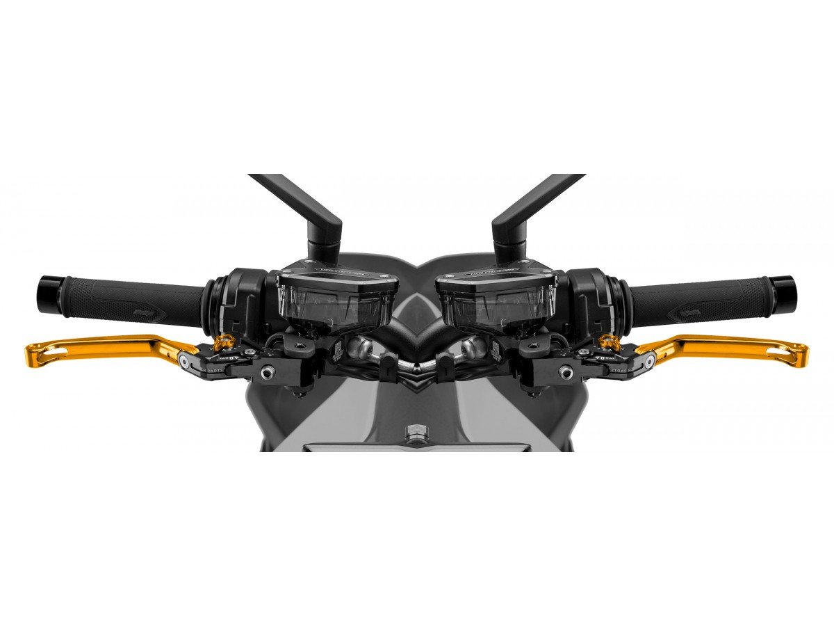 Zestaw regulowanych, sportowych klamek - komplet: dźwignia sprzęgła, dźwignia hamulca i odpowiednie mocowania do motocykla.