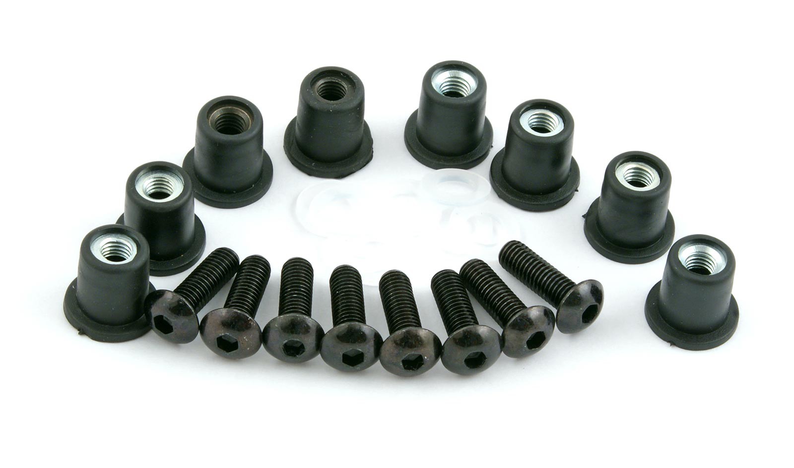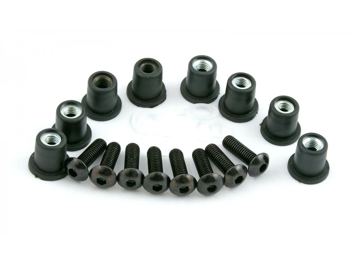 Śrubki w rozmiarze M5x16. Rozmiar gumki z wbudowanym gwintem: średnica 10 mm, średnica kołnierza 14 mm, grubość kołnierza 1 mm, głębokość całkowita 14 mm. To najpopularniejszy rozmiar - ale przed zakupem upewnij się, że w Twoim motocyklu szyba jest mocowana właśnie za pomocą takich śrubek.