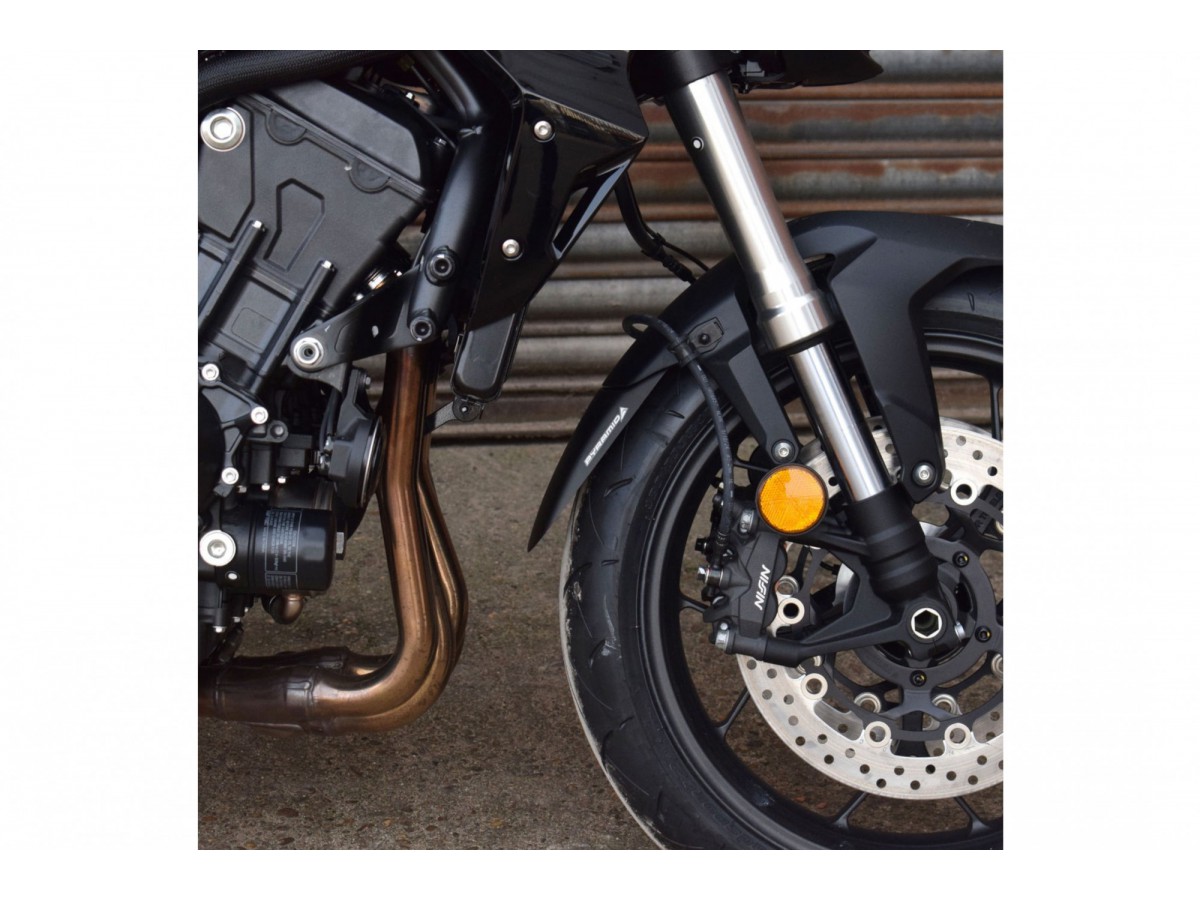 Przedłużenie przedniego błotnika zapewnia ochronę dolnej części motocykla - kolektorów układu wydechowego, owiewek i innych elementów - przed zabrudzeniami z przedniej opony.