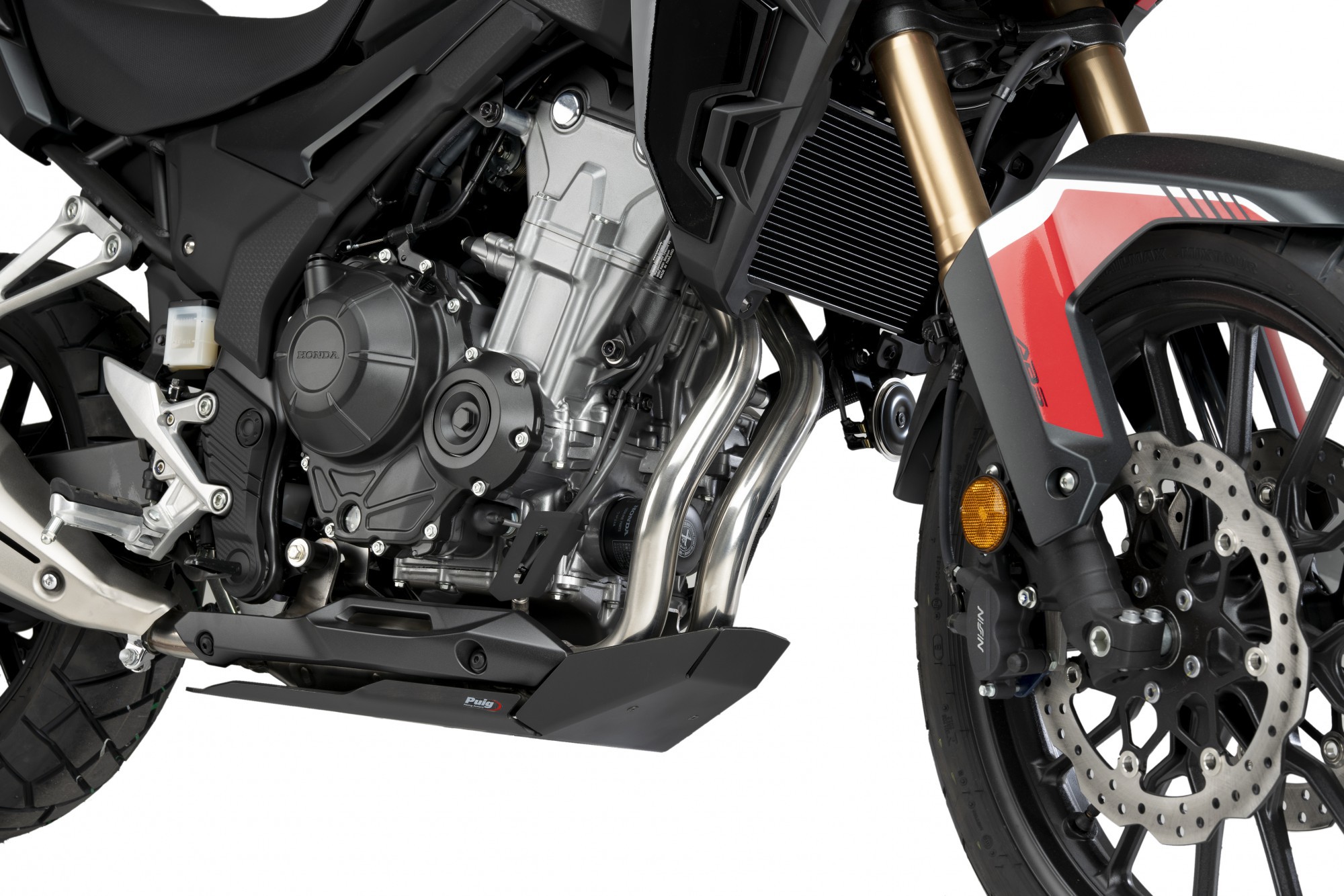 Aluminiowa płyta pod silnik chroni elementy motocykla przed uszkodzeniem podczas jazdy off road.